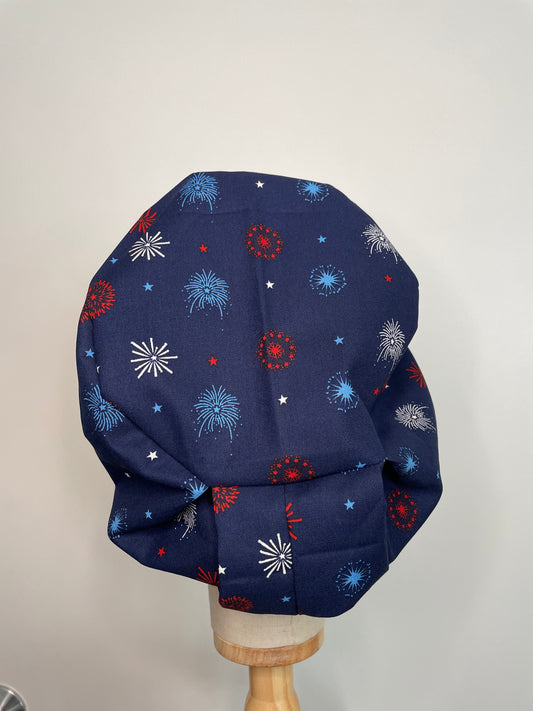 • Fireworks on Blue Scrub Cap - Satin Lining Available - Multiple Styles
