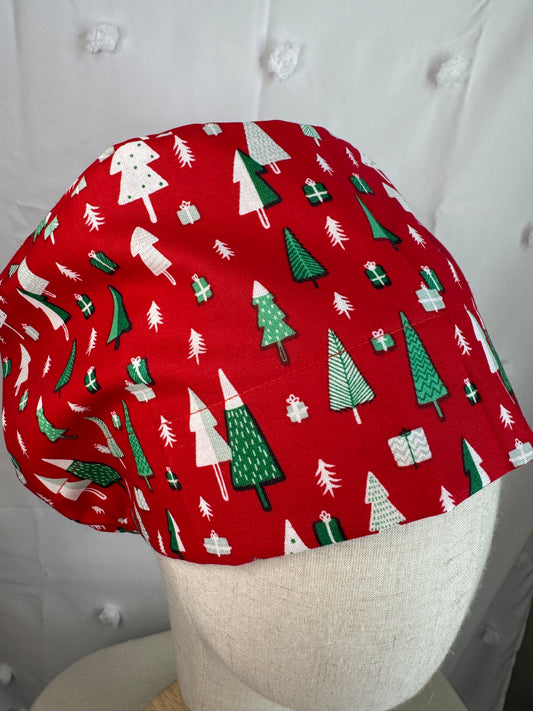 Christmas Trees on Red Scrub Cap - Satin Lining Available - Multiple Styles