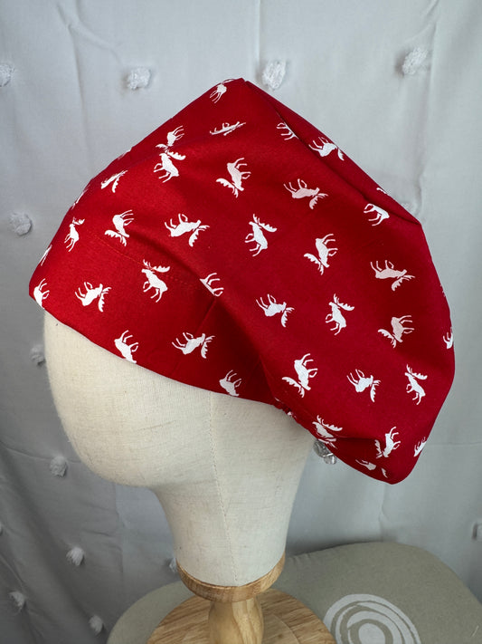 Small White Moose on Red Scrub Cap - Satin Lining Available - Multiple Styles