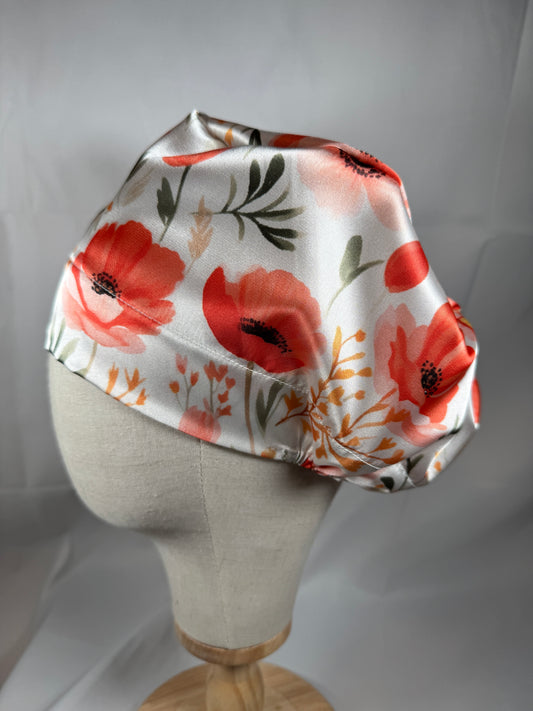 Poppies on White Silky Satin Charmeuse Scrub Cap - European Style