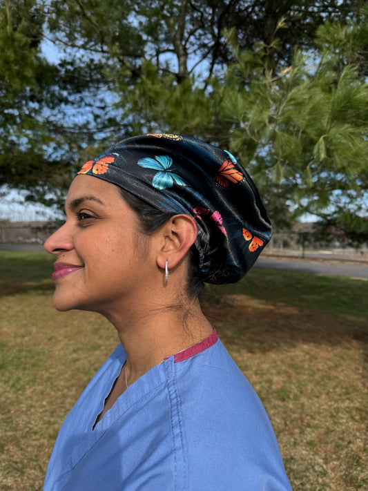 Butterflies With Palm on Dark Satin Textured Charmeuse Scrub Cap - European Style