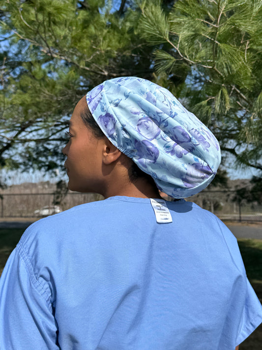 Light Blue and Lilac Floral Silky Smooth Chiffon Stretch Scrub Cap - European Style