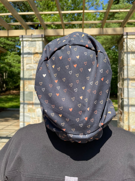 Mini Hearts on Black Scrub Cap - Satin Lining Available - Multiple Styles*