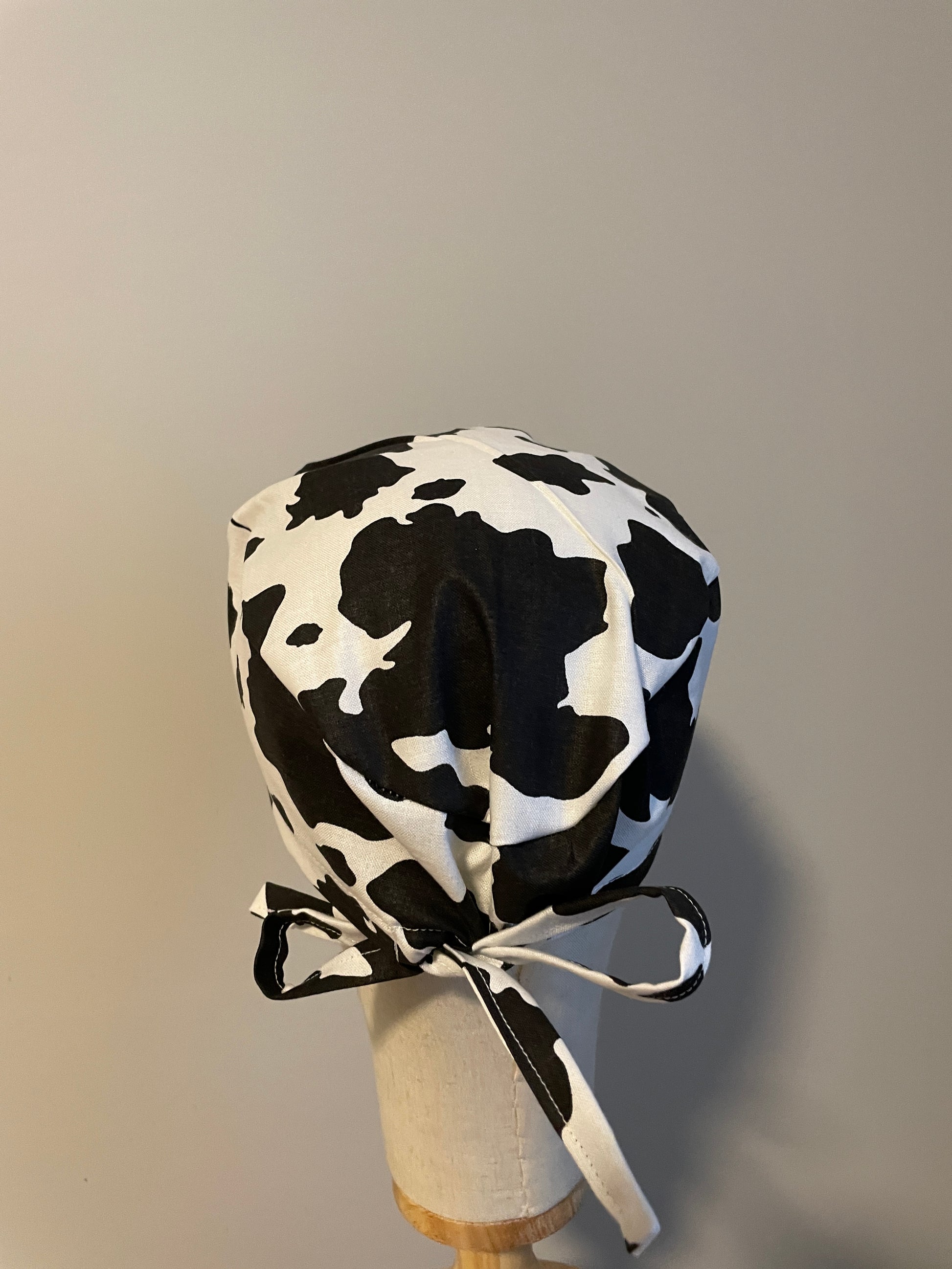 This Pixie style scrub cap is a slim fitting cap perfect for short to medium length hair. This style is double lined scrub cap allowing you to fold it over to create a customized fit with elastic and ties in the back to hold your low bun or small pony in all day with a stylish bow at the nape of your neck!