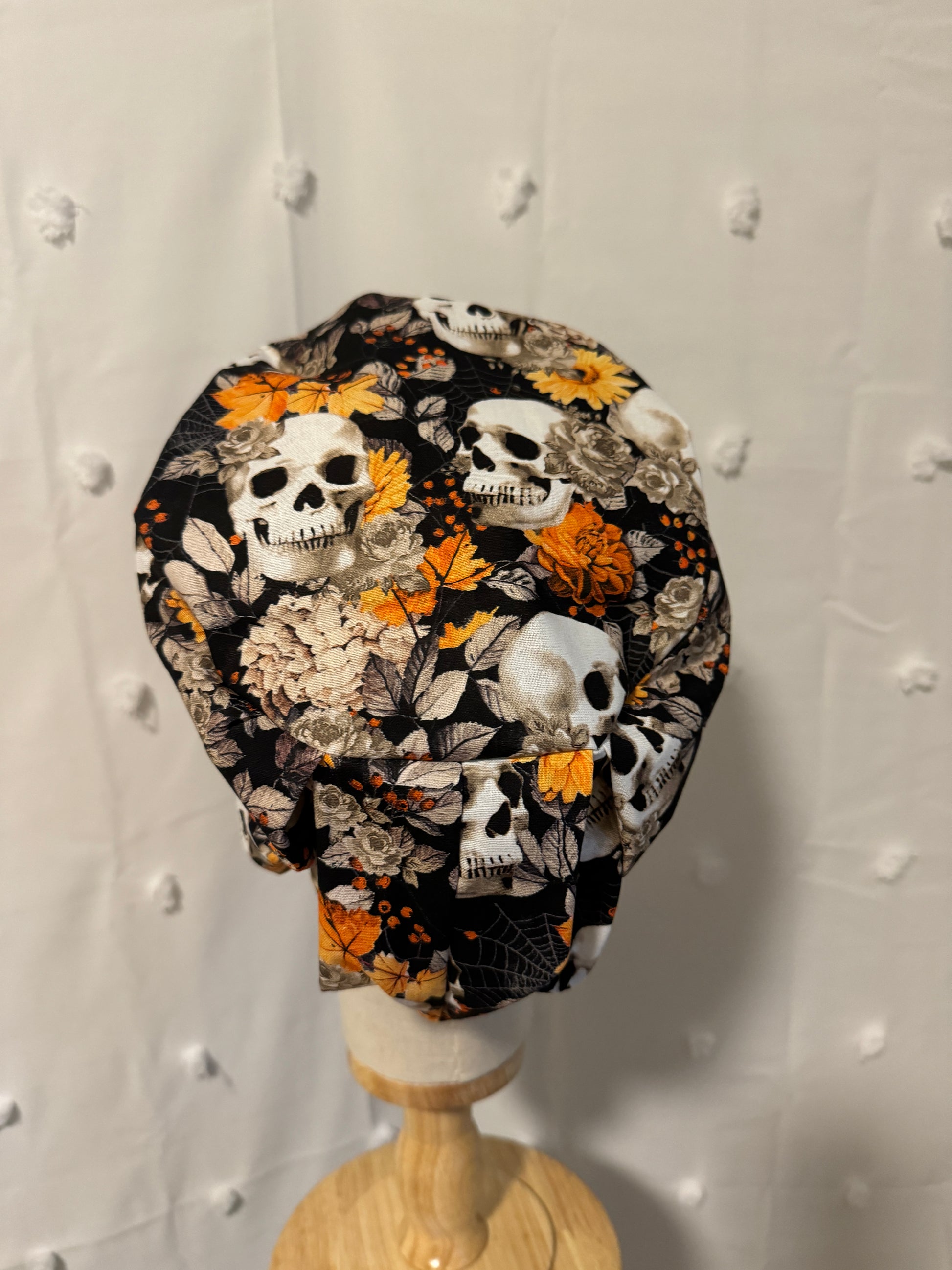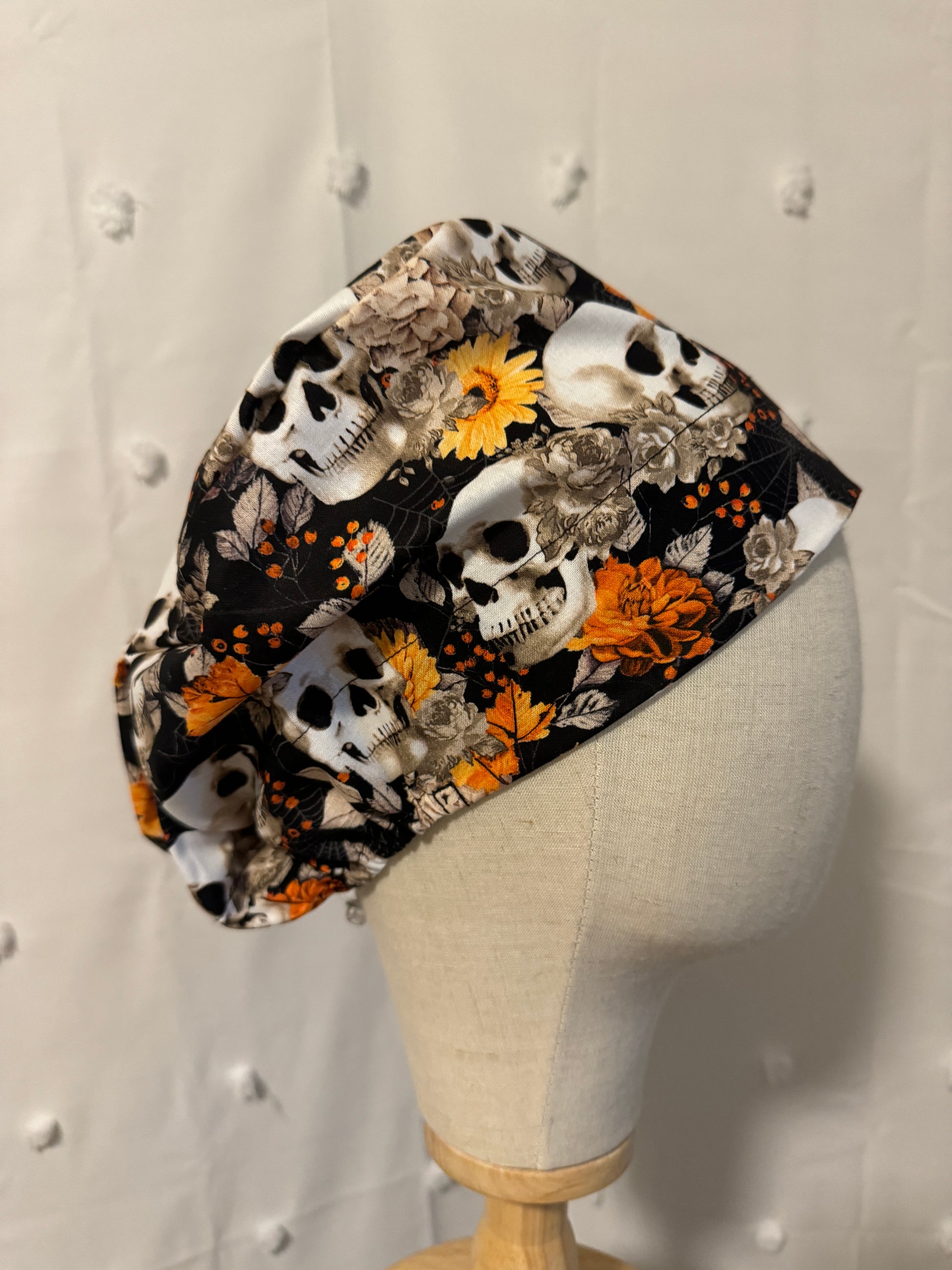 Orange & Black Skulls & Floral Scrub Cap - Satin Lining Available - Multiple Styles