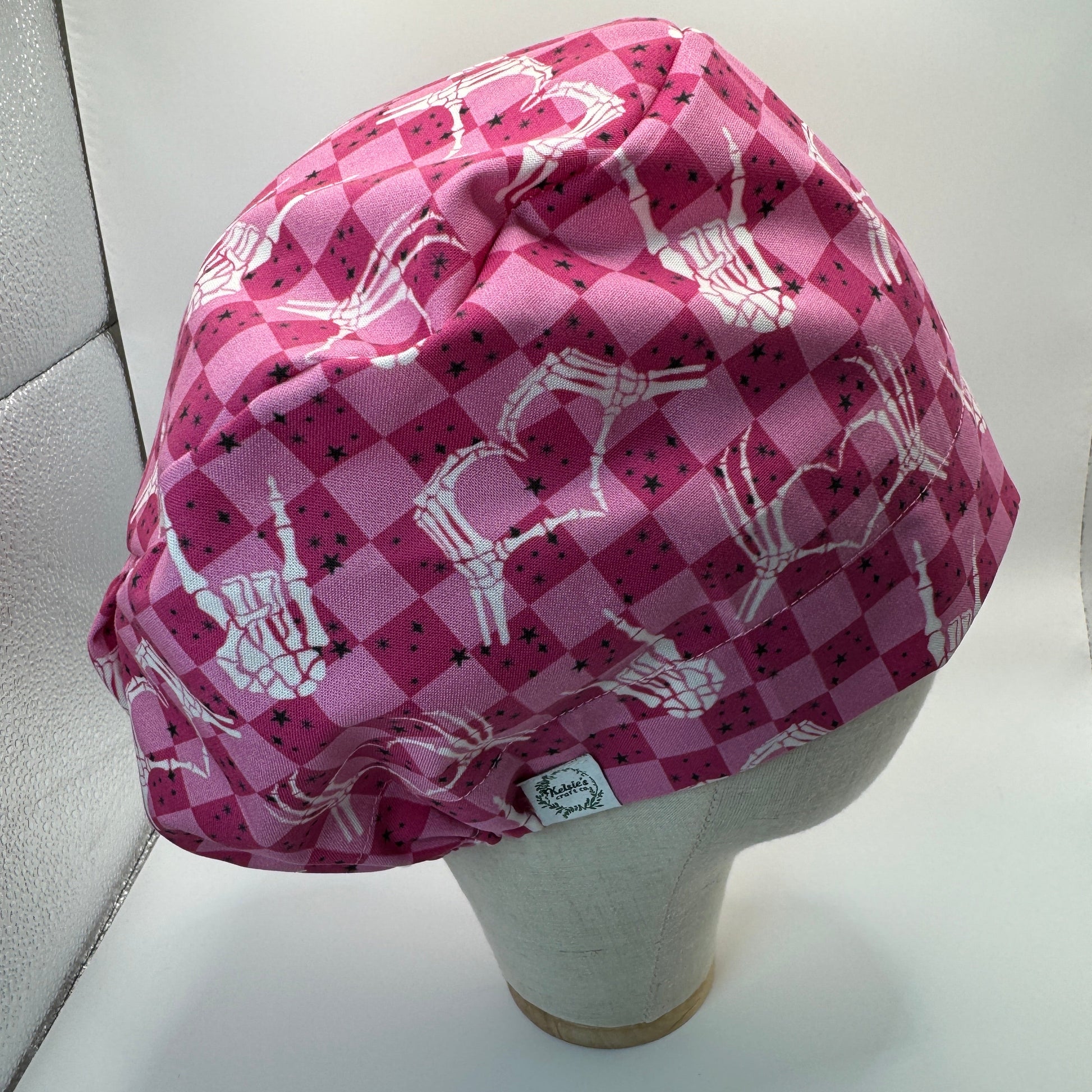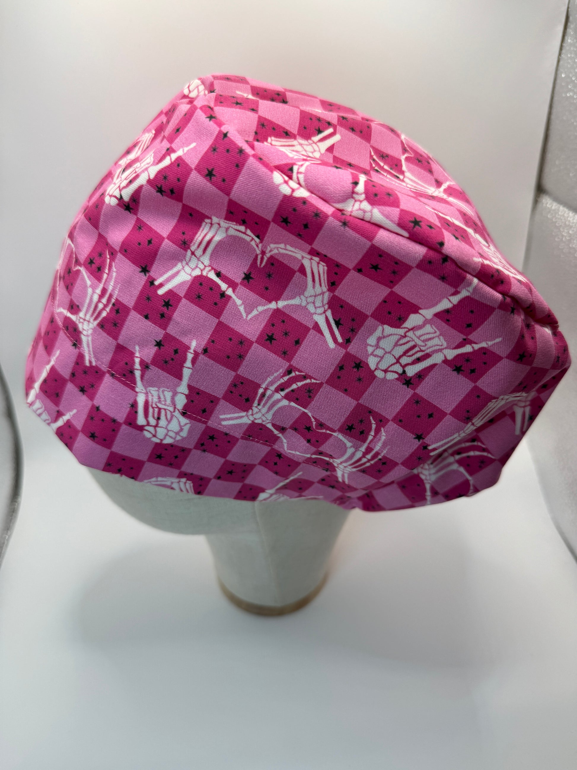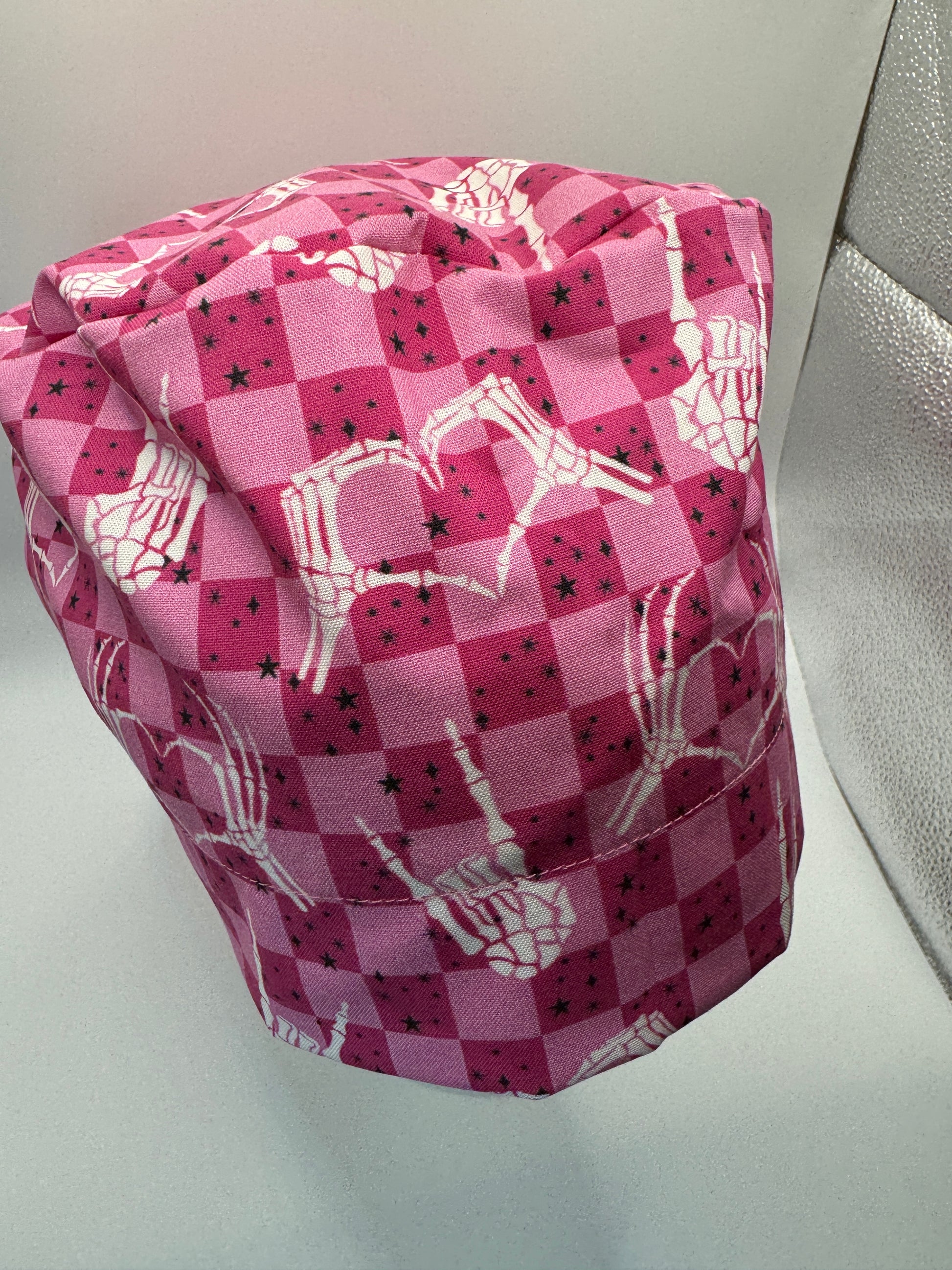 Pink Checkered Skeleton Hands Scrub Cap - Satin Lining Available - Multiple Styles