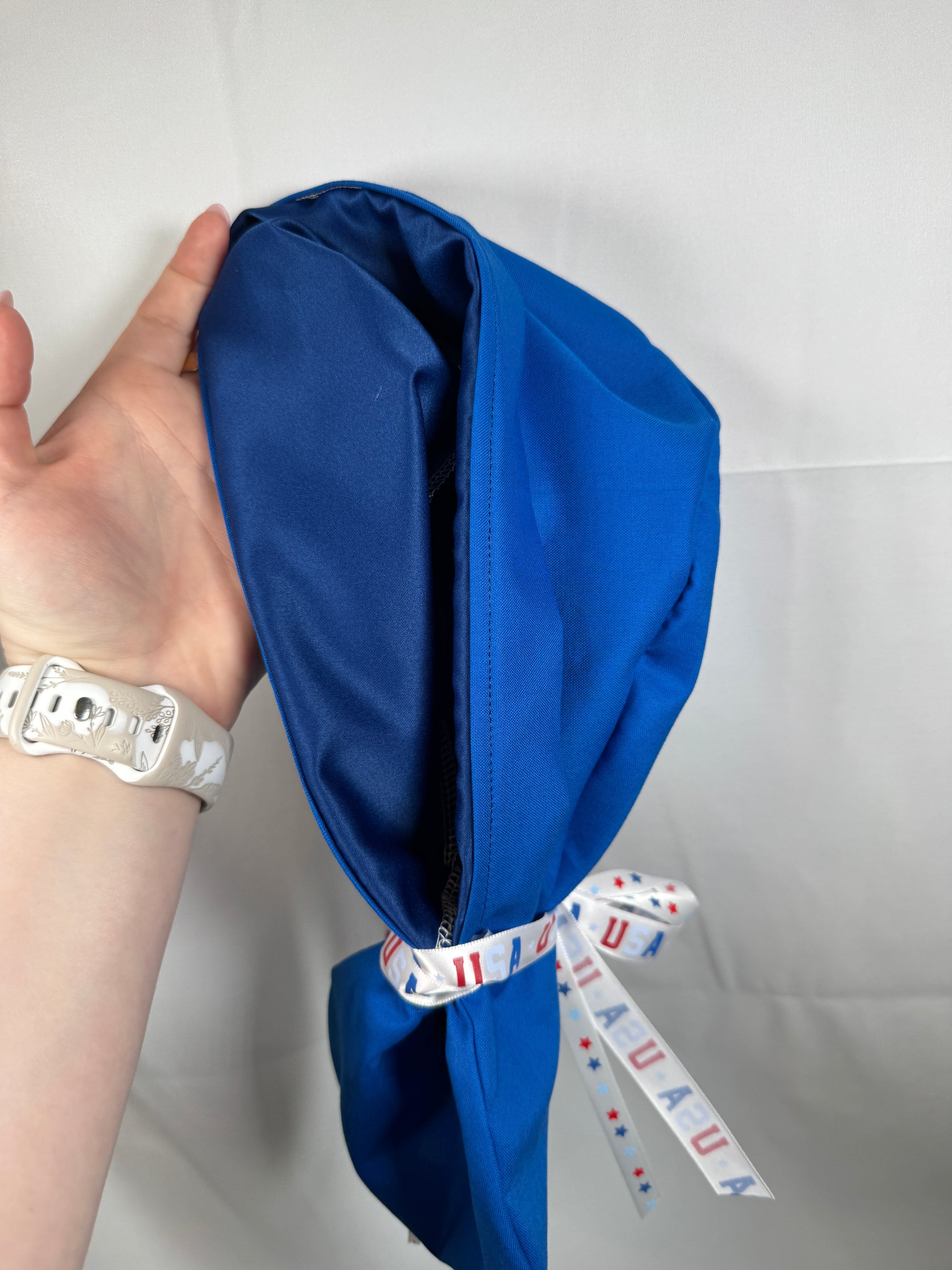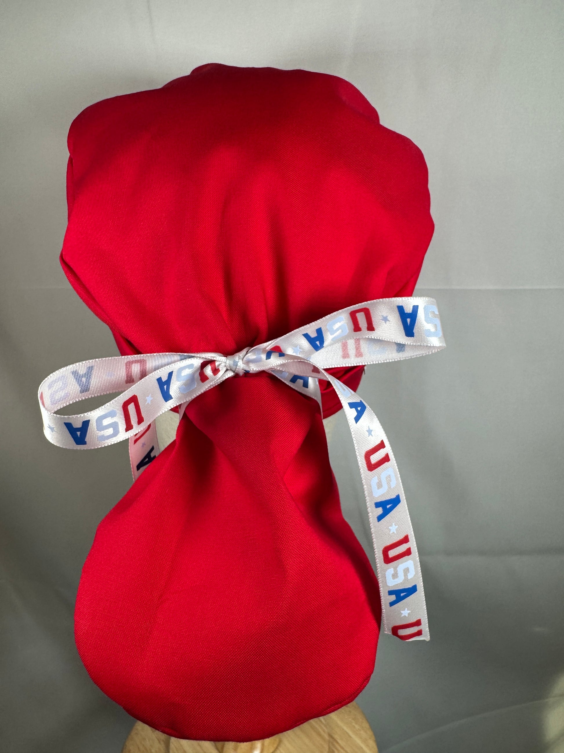 USA Ribbon Pony Tail Scrub Cap in Red or Blue Fabric - Satin Lining Available