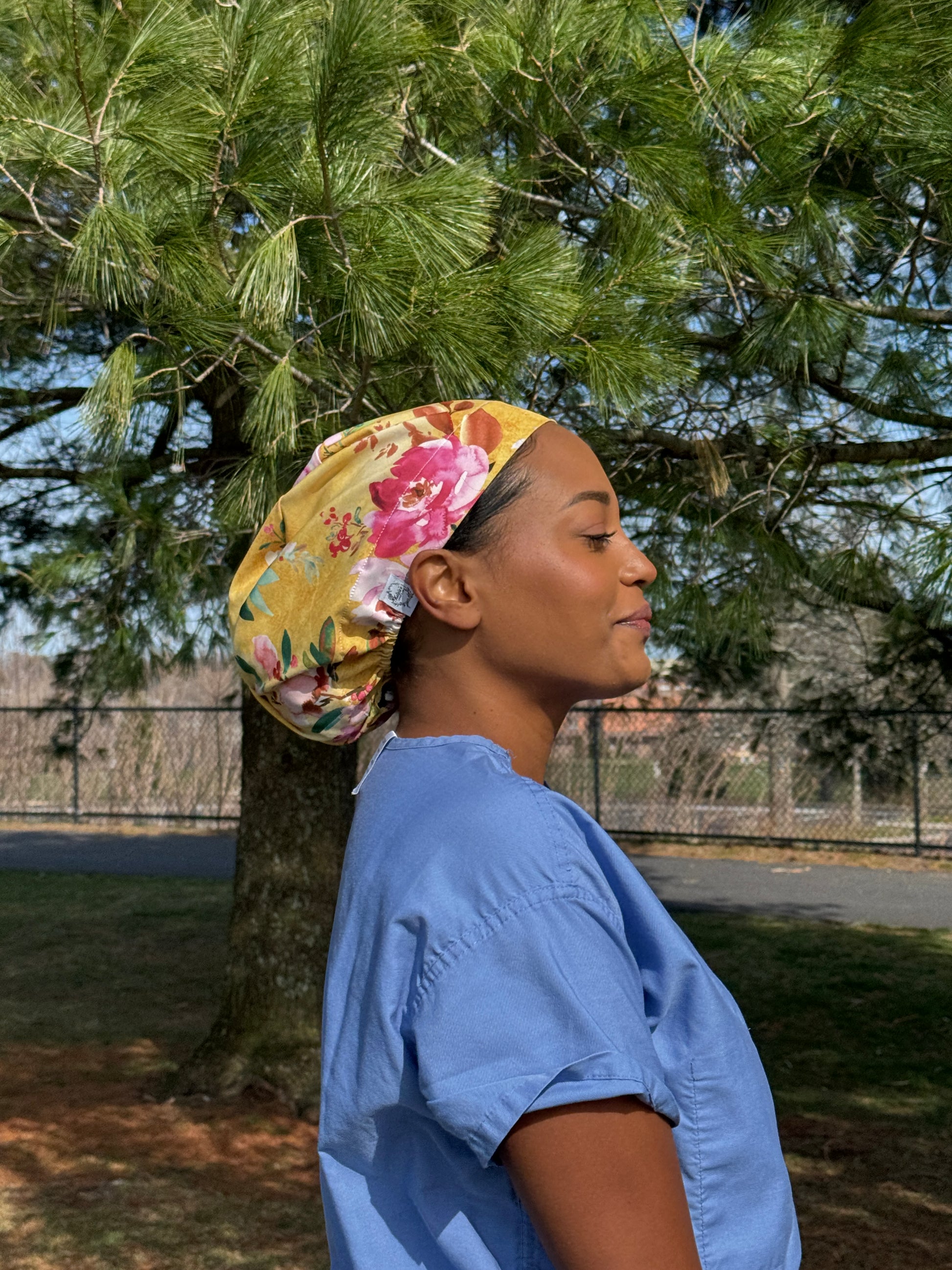Yellow Floral Silky Smooth Chiffon Stretch Scrub Cap - European Style